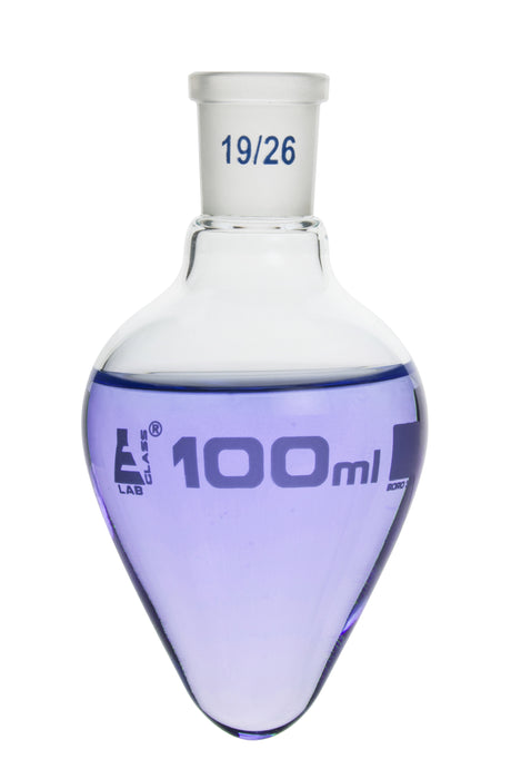 Borosilicate glass, pear shaped, short neck, with interchangeable joint. DIN 12383 Capacity: 100 ml, Socket: 19/26