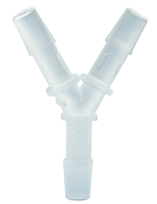 Pollypropylene, three way, riffled end for rubber tubing. Y shape, 8 mm, Pollypropylene, three way, riffled end for rubber tubing.