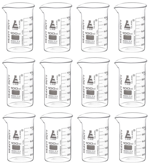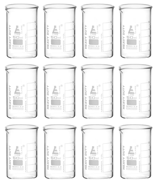 Pack of 12 heavy duty beakers made of high quality, heavy duty, borosilicate 3.3 glass. 2.2mm thick, uniform walls provide excellent strength against breakage. 50ml capacity. Beakers feature 10ml white, printed graduations and has a ±5% accuracy.