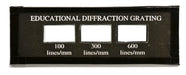 For demonstrating the principle of the diffraction grating and the way in which its properties are dependent upon the number of lines per unit length. Comprises a card mount 90 x 40 mm approximately with three 16 x 9 mm apertures, each containing a diffraction grating replica. The grating are of 100 lines / mm, 300 lines / mm and 600 lines /mm respectively and protected cover glasses.