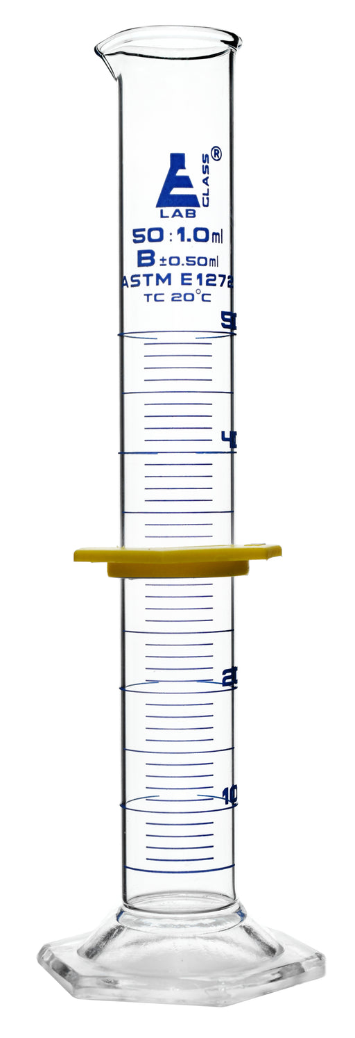 View full detailsMeasuring Cylinder, 50ml - Class B - Detachable, Plastic Hexagonal Base & Protective Collar - Blue Graduations - Borosilicate Glass - Eisco Labs