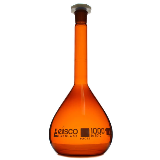 Eisco Amber Volumetric Flask, 1000mL - Class A - Borosilicate Glass, Polyethylene Stopper, 19/26 Socket - QR Code Marking for Calibration Certificate