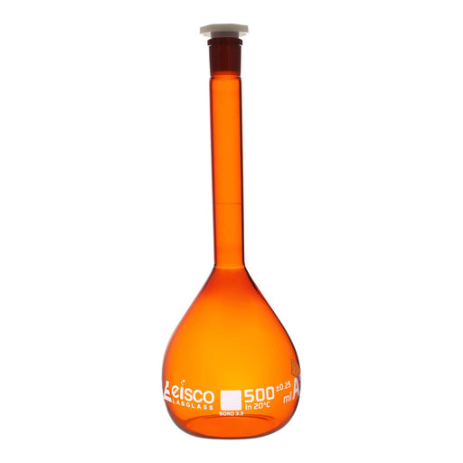 View full detailsEisco Amber Volumetric Flask, 500mL - Class A - Borosilicate Glass, Polyethylene Stopper, 19/26 Socket - QR Code Marking for Calibration Certificate