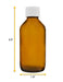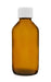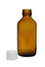 Pack of twelve 100ml capacity reagent bottles made of heavy duty, amber colored soda glass. Bottle includes a white screw cap to ensure a tight seal. Bottle stands 4.6" tall, with a base measuring 1.9" wide. Inner diameter of bottle mouth measures 0.7".