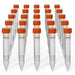 15mL non-sterile polypropylene centrifuge tubes with flat caps, pack of 25. Designed for secure sample storage, research, and laboratory applications. USP Class VI, FDA compliant, and suitable for various lab environments.