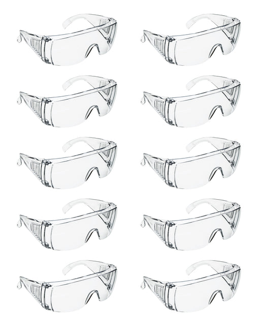 Pack of 10 industrial quality safety goggles. Designed to protect your eyes from chemical splashes, high speed particles, dust and UV wavelengths (...