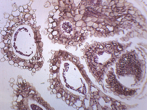 Single, prepared slide of a cross section of apple tree stem. Apple is a dicot Stained for better visualization of characteristic dicot stem struc...
