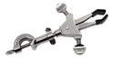 This 2 Prong Double Adjustable Universal Clamp features an integral boss head and non-slip vinyl coated jaws. The item has an adjustable length of 7.5"-8" and has a width of 4" at the thumb screws. The jaws measure 2" long and open 3" wide, and the jaws are adjustable on both sides with thumb screws. This clamp with boss head is ideal for use with straight sides glassware apparatus such as tubes, flask necks, and burettes.