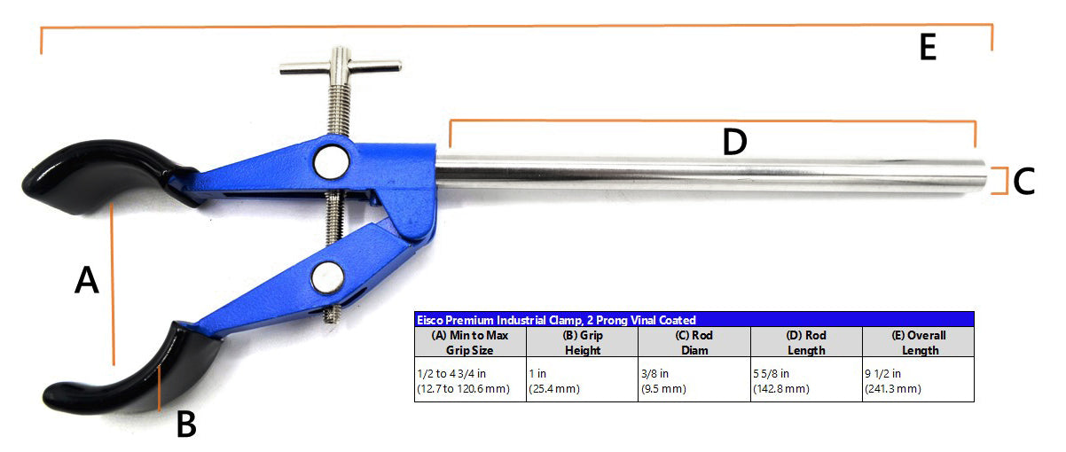 - 2 VINYL COATED PRONGS || Clamp accepts burettes, flasks & beakers measuring up to 11 cm (4.3"). Vinyl coated prongs provide a strong, slip-free hold. Thread fitted actuating joints
