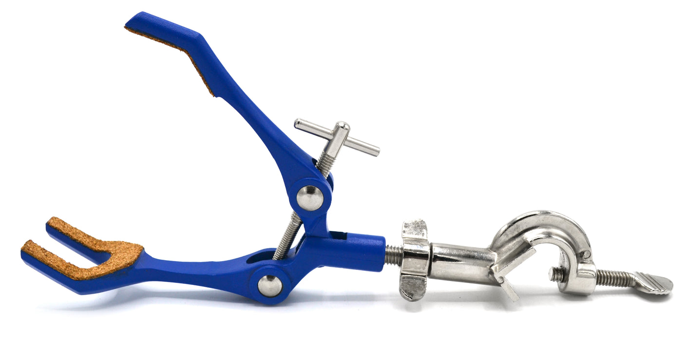 The clamp includes a high strength alloy Boss Head for securing the clamp to a frame or other apparatus. The Boss Head will accept a rod diameter of 18 mm (approximately 11/16"). The screw adjustment allows for precise pressure when gripping glass objects, to avoid potential breakage. Swivel between Clamp and Boss Head. Clamp is constructed of powder coated high grade zinc alloy. Due to the cork lining it is not recommended that the fingers of the clamp are placed in direct heat. Ideal uses for beakers, Erlenmeyer flasks, test-tubes, boiling (Florence) flasks, burettes.