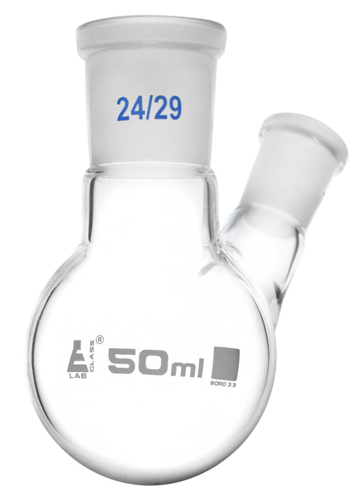 View full detailsDistilling Flask, 50ml - 24/29 Oblique Neck - 14/23 Side Socket - Round Bottom - Borosilicate Glass - Eisco Labs