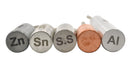 5 piece specific gravity metal cylinder set. Each cylinder features a top hook. Set includes Copper, Tin, Aluminum, Zinc, and Stainless Steel. Each cylinder has the same 0.5" (12.5mm) diameter and 30g mass but are various lengths. Since these cylinders are equipped with hooks, they can be easily lifted from boiling water. Additionally, the hooks allow each cylinder to be easily massed using a spring scale (scale not included).