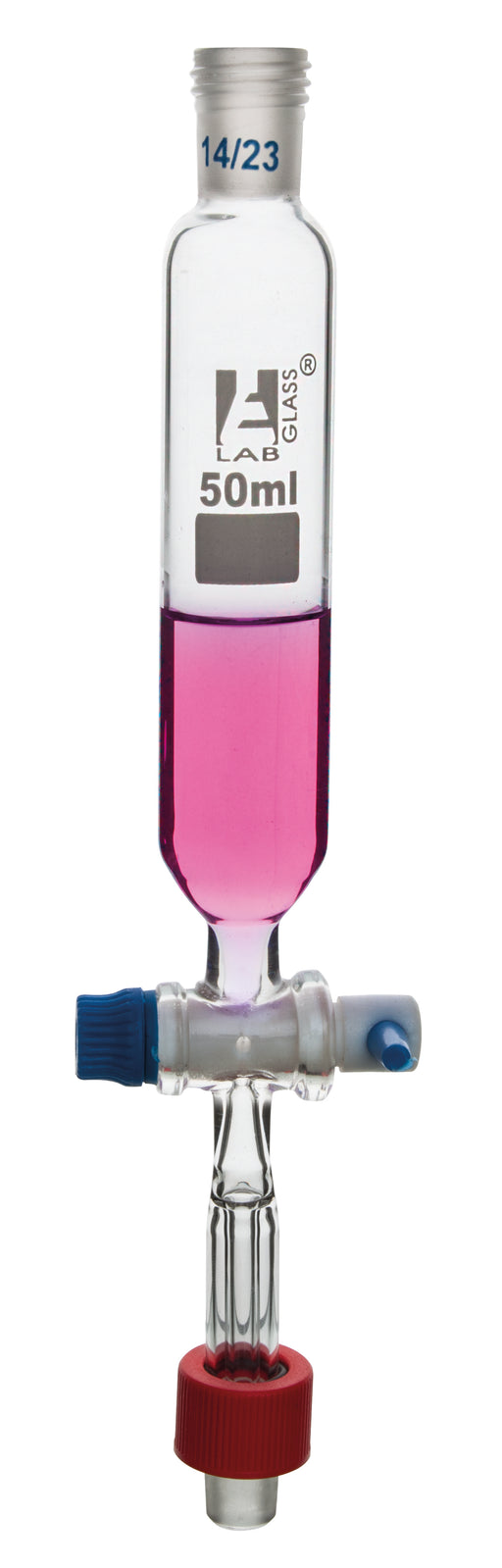 Dropping Funnel, 50ml - Pressure Equalizing - 14/23 Plastic Stopper, Glass Key Stopcock - Cylindrical, Borosilicate Glass - Eisco Labs