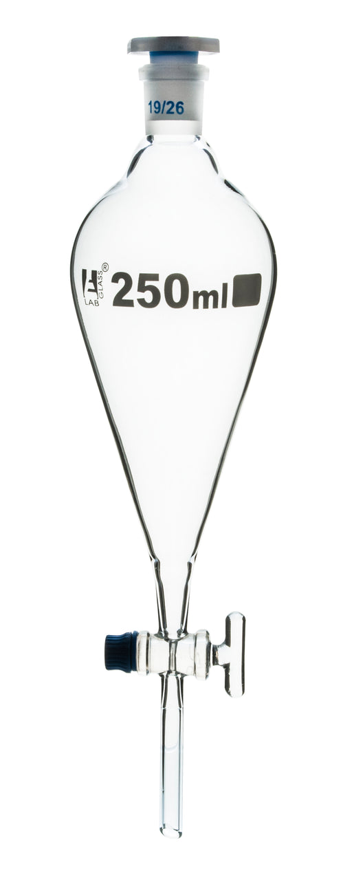 Squibb Separating Funnel, 250ml - 19/26 Plastic Stopper, Glass Key Stopcock, Ungraduated - Borosilicate Glass - Eisco Labs
