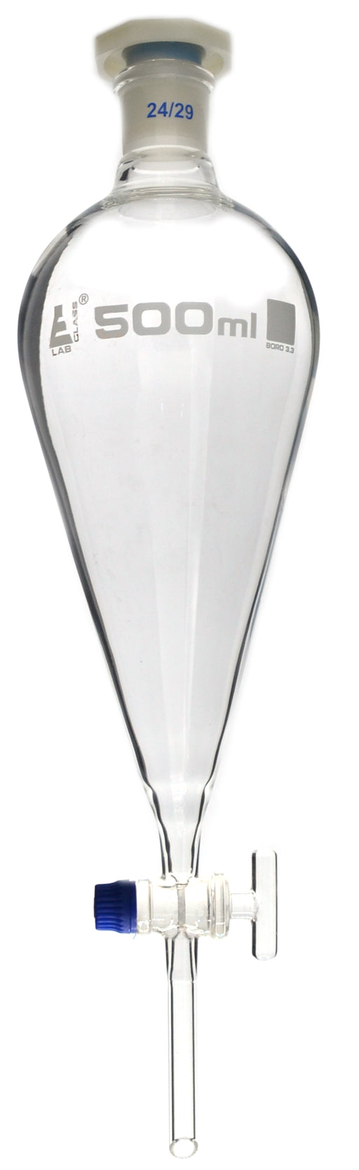 Borosilicate glass with interchangeable plastic stopper and PTFE Key stopcock. Graduated. Cap. 500 ml, Socket Size 24/29