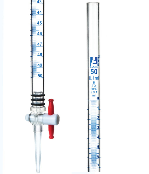 Burette, Acrylic, 50mL - Class B - 0.5mL Blue Graduations - With PTFE Key Stopcock