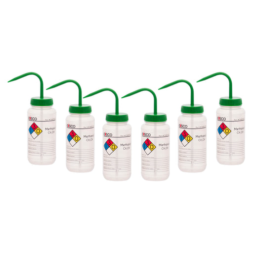 Pack of six Methanol wash bottles, 500ml capacity each Easy to read labeling, including chemical information and safety warnings (4 colors) Wide M...