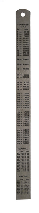 - One side contains measurements from 0 - 30 cm and 0 - 300 mm, flip side provides a conversion table for converting in to mm
