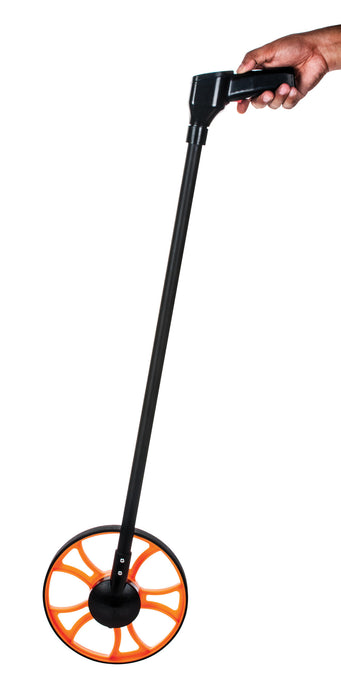 Fast, simple way to measure long distances. Simply roll the wheel along the ground. The circumference of the wheel is 1 meter and with every revolution it produces an audible click. The scale is graduated in 1 cm divisions. Sturdy, plastic handle enables the user to walk while rolling the wheel.