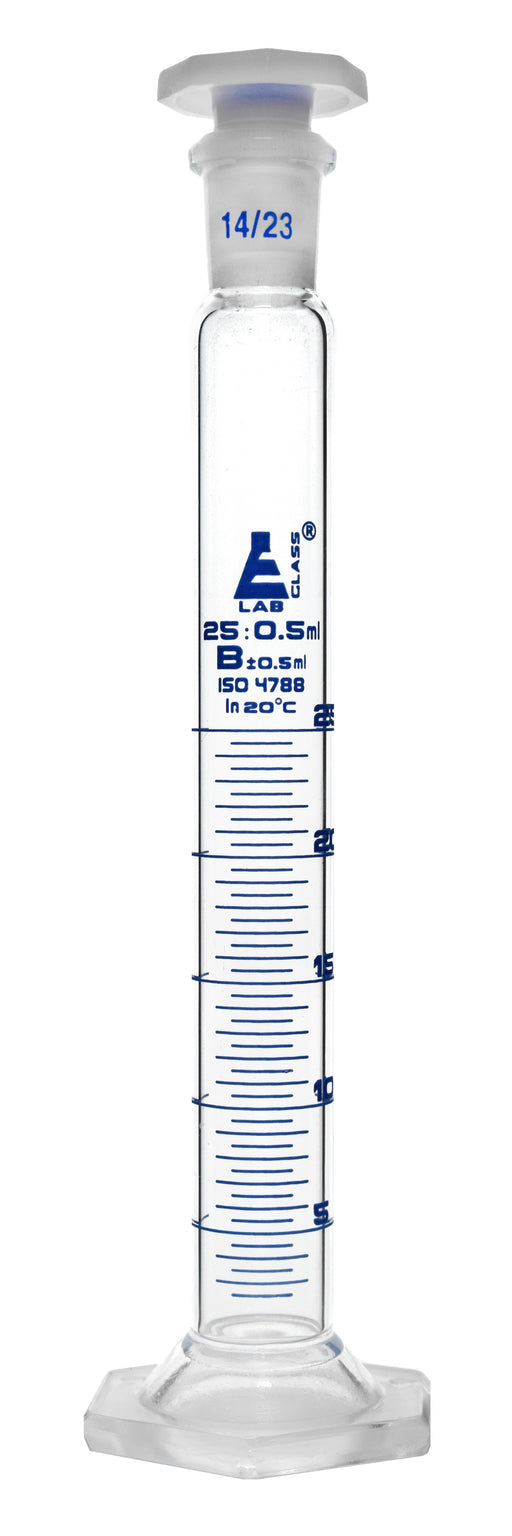 View full detailsMeasuring Cylinder, 25ml - Class B - 14/23 Polypropylene Stopper - Hexagonal Base, Blue Graduations - Borosilicate Glass - Eisco Labs