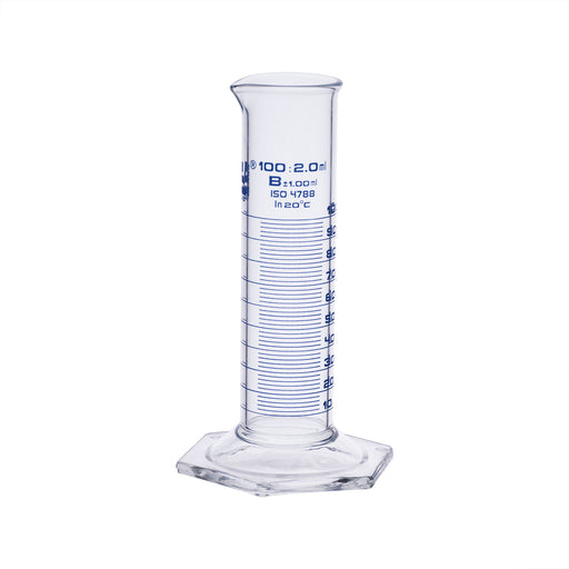 View full detailsMeasuring Cylinder, 100ml - Class B - Detachable, Plastic Hexagonal Base & Protective Collar - White Graduations - Borosilicate Glass - Eisco Labs