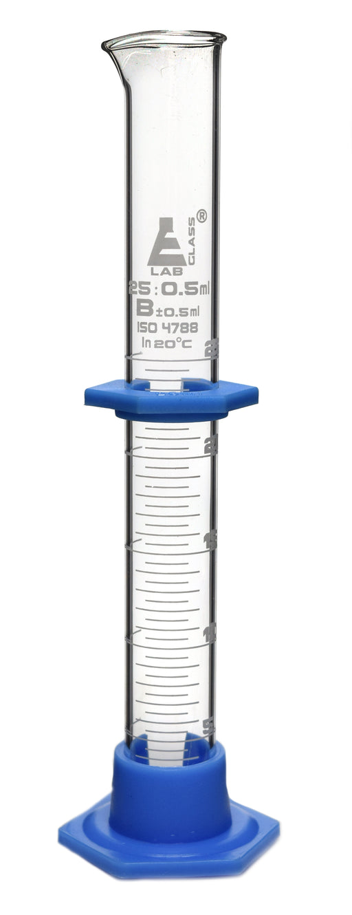View full detailsMeasuring Cylinder, 25ml - Class B - Detachable, Plastic Hexagonal Base & Protective Collar - White Graduations - Borosilicate Glass - Eisco Labs