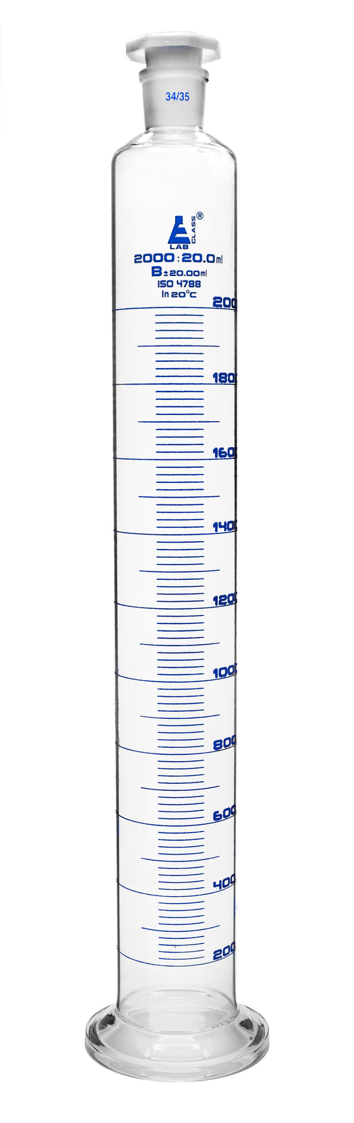 Measuring Cylinder, 2000ml - ASTM Class B Tolerance ±20.00ml - Polypropylene Stopper, 34/35 - Hexagonal Base - Blue Graduations - Borosilicate 3.3 Glass - Eisco Labs