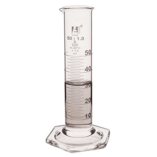 High quality borosilicate glass Detachable Hexagonal Base and Protective Collar. White graduation lines, marked every 5ml Tolerance ±0.05ml 6.75" ...