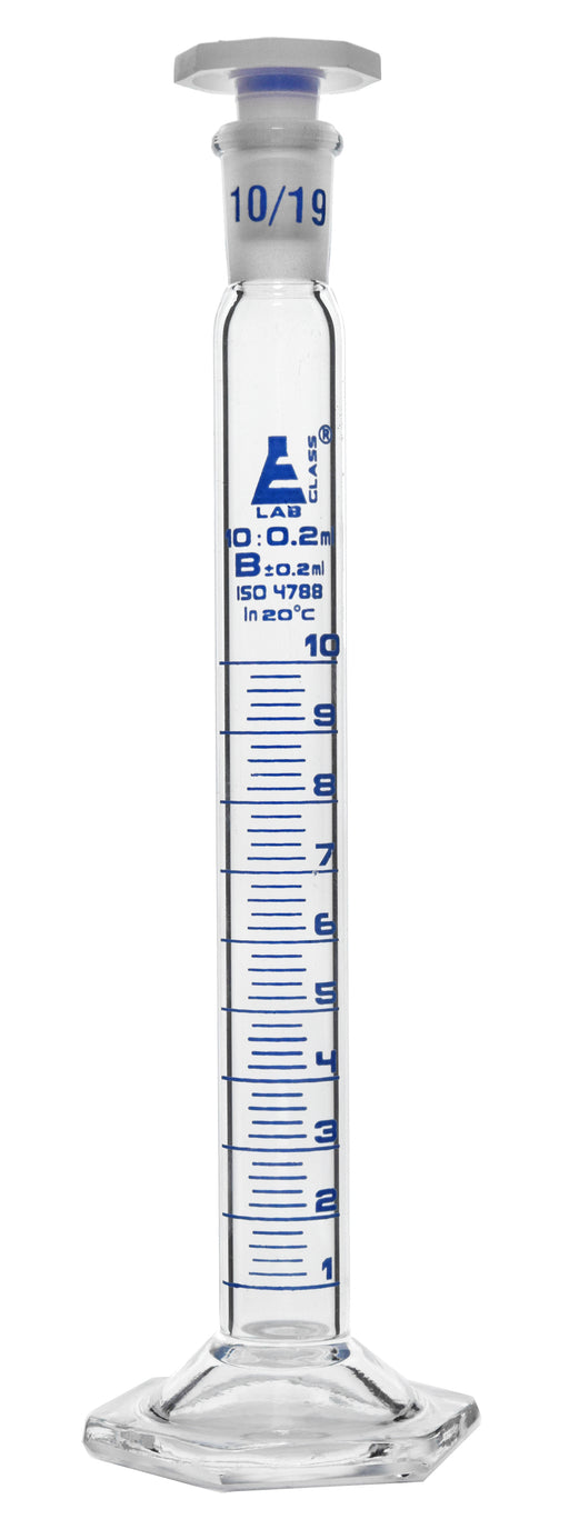 Measuring Cylinder, 10ml - Class B - 10/19 Polypropylene Stopper - Hexagonal Base, Blue Graduations - Borosilicate Glass - Eisco Labs
