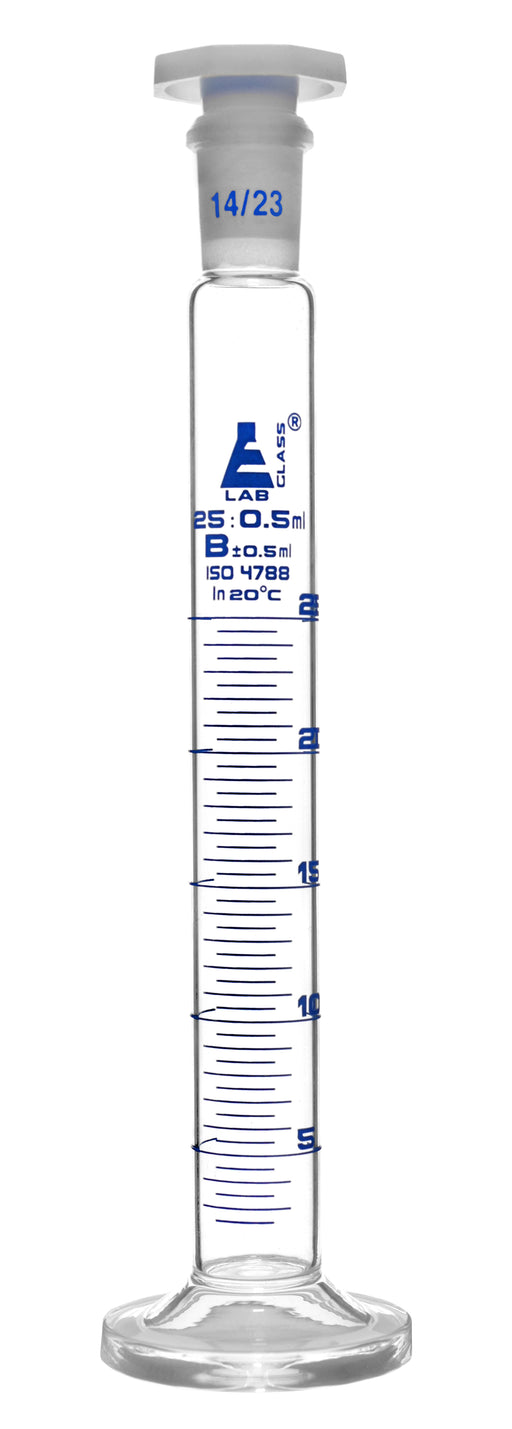 Class B measuring cylinder made of high quality borosilicate 3.3 glass Fitted with interchangeable 14/23 polypropylene stopper Sub. Div.: 0.5ml, T...