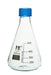 Erlenmeyer conical flask with Teflon lined screw cap. 500ml capacity, with white graduations marked every 100ml. Flask measures 7" tall, and 4" in diameter. Neck diameter measures 0.75".