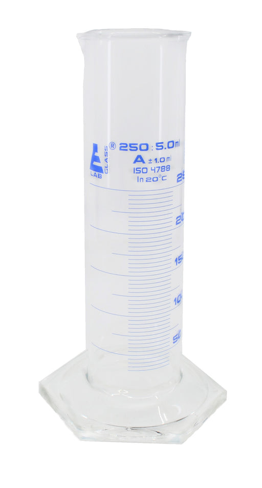 Measuring Cylinder, 250ml - Class B Tolerance ±2.00ml - Polypropylene Stopper, 24/29 - Hexagonal Base - Blue Graduations - Borosilicate 3.3 Glass - Eisco Labs