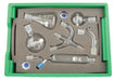 This set contains 16 items. Housed in diecut foam lined box placed in  single Gratnells ® tray and lid. Designed for quantities starting material up to 150 g Consists of Item, Socket Size,  Joint Size 1 Still head, 14/23, 19/26 1 Receiver adapter, 19/26, 24/29 1 Air leak / steam inlet, ---, 19/26 1 Liebig condenser, 19/26, 19/26 1 Dropping funnel, 100 ml, 19/26, 19/26 1 Reduction adapter, 19/26, 19/26 1 Multiple adapter,  19/26, 24/29 1 Flask, round bottom, 50 ml, 24/29, --- 1 Flask, erlenmeyer, 250 ml, 24/29, --- 1 Flask, round bottom, 250 ml, 24/29, --- 2 Stopper, ---, 19/26 1 Thermometer packet, ---, 14/23 1 Receiver adapter, 19/26, --- 1 Flask, round bottom, 100 ml, 24/29, --- 1 Stoppers, ---, 24/29