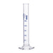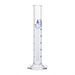 Graduated cylinder made of Borosilicate 3.3 glass. Features spout and hexagonal base. Blue graduations.