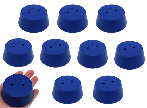 Pack of ten #11.5 stoppers made of long lasting neoprene rubber. Blue color. Each stopper features two holes measuring 5mm in diameter. Manufacture...