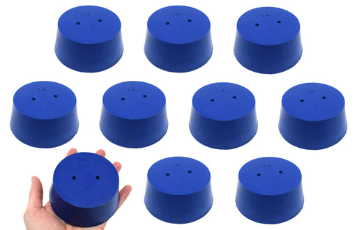 Pack of ten #14 stoppers made of long lasting neoprene rubber. Blue color. Each stopper features one hole measuring 5mm in diameter. Manufactured a...