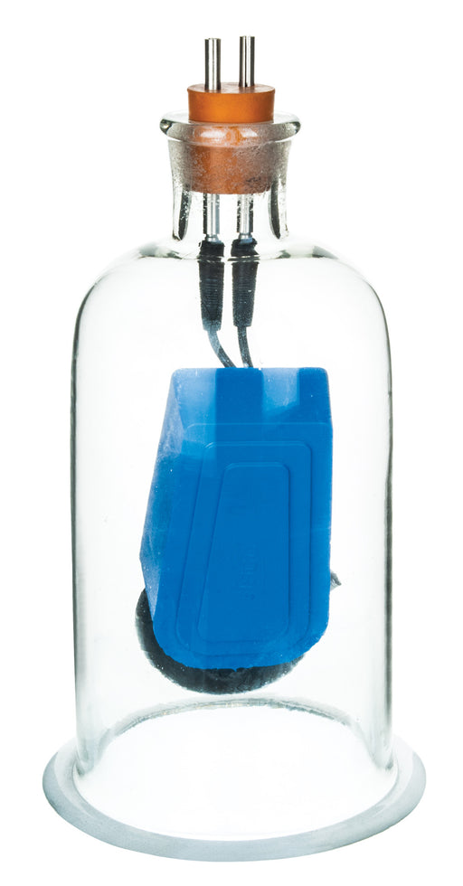 Fine coiled wire connections to terminals mounted in rubber bung sealing the Glass jar. A 15cm. Dia. electric bell also suspended on rubber cord in...