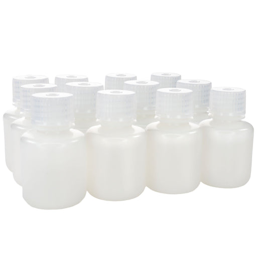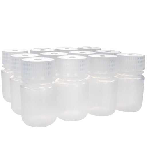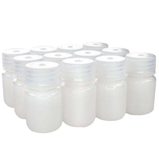 PACK OF 12 HDPE REAGENT BOTTLES || Includes twelve 30mL translucent wide-mouth bottles made of HDPE, featuring polypropylene caps, ideal for reage...