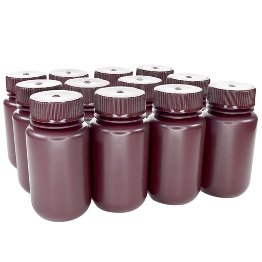 PACK OF 12 AMBER REAGENT BOTTLES || Includes 12 sterile 125mL wide-mouth HDPE bottles with polypropylene caps, designed for laboratory sample stor...
