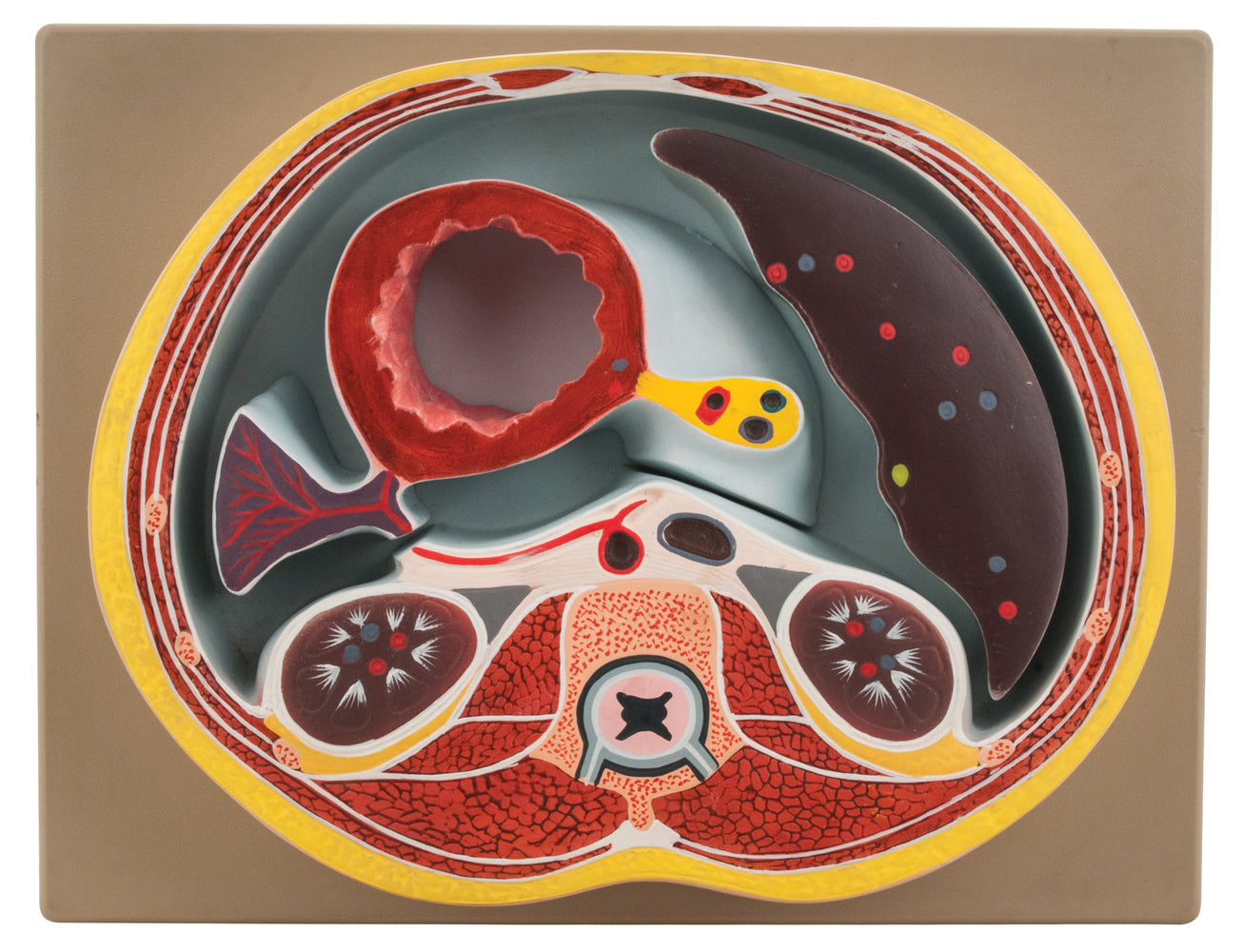 Traverse section model of human abdomen at level of omentum foramen. Mounted on base. Numbered with English Key Card.Size 42 x 30 x 8 cm approx. Weight 1.5 kg approx.