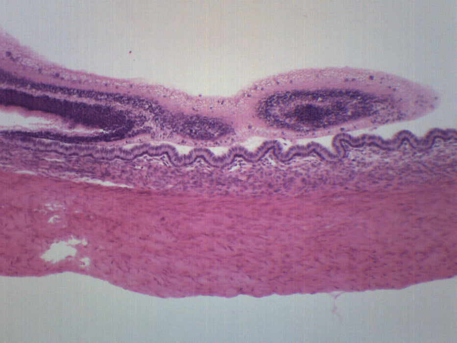 - Stained with Hematoxylin and Eosin for better visualization of eye structures, including the optic nerve entrance
