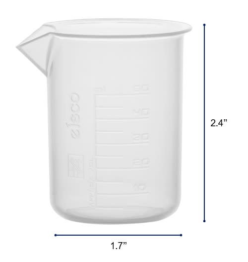 50ml beaker made of premium quality, translucent polypropylene plastic. 5ml raised graduations and specifications. Beaker features a tapered spout for easy pouring.