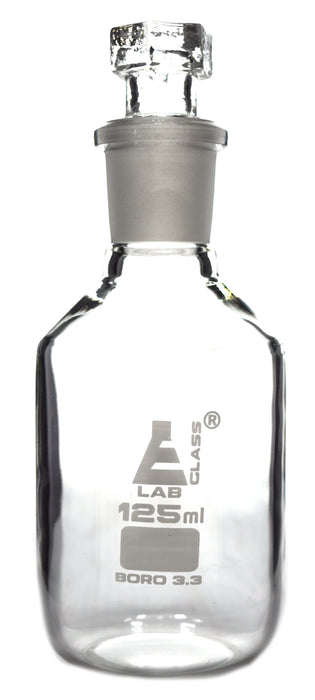 Reagent Bottle, Borosilicate Glass, Narrow Mouth with Interchangeable Hexagonal hollow glass Stopper - 125ml - Eisco Labs