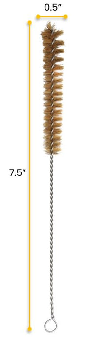 Brush measures 7.5" in total length, with the bristle section measuring 3.25" and 0.5" in diameter, and handle measuring 4.25". Fits tubes, pipes, bottles, cylinders, flasks and straws with diameters of 0.25" - 0.4".