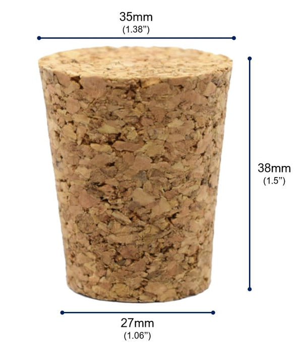 Pack of 10 cork stoppers. Size #16 - each stopper measures 38mm in length, has a base diameter measuring 27mm, and a top diameter measuring 35mm. Corks are made of natural bark material and feature a tapered shape. The reliable construction will not crumble or break easily.