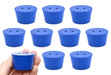 Pack of ten #8 stoppers made of long lasting neoprene rubber. Blue color. Each stopper features two holes measuring 5mm in diameter. Manufactured according to sizes recommended by ASTM standards. Each stopper measures 25mm in length, has a base diameter measuring 33mm, and a top diameter measuring 41mm. The neoprene rubber construction is suitable for use with petroleum products, minerals, oils and fats, as well as most inorganic acids and bases. Resistant to temperatures ranging from -40 to 130°C.