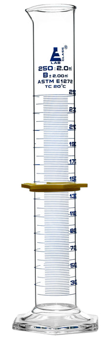 Measuring Cylinder, 250ml - ASTM Class B Tolerance ±2.00ml - Protective Collar, Hexagonal Base - Blue Graduations - Borosilicate 3.3 Glass - Eisco Labs