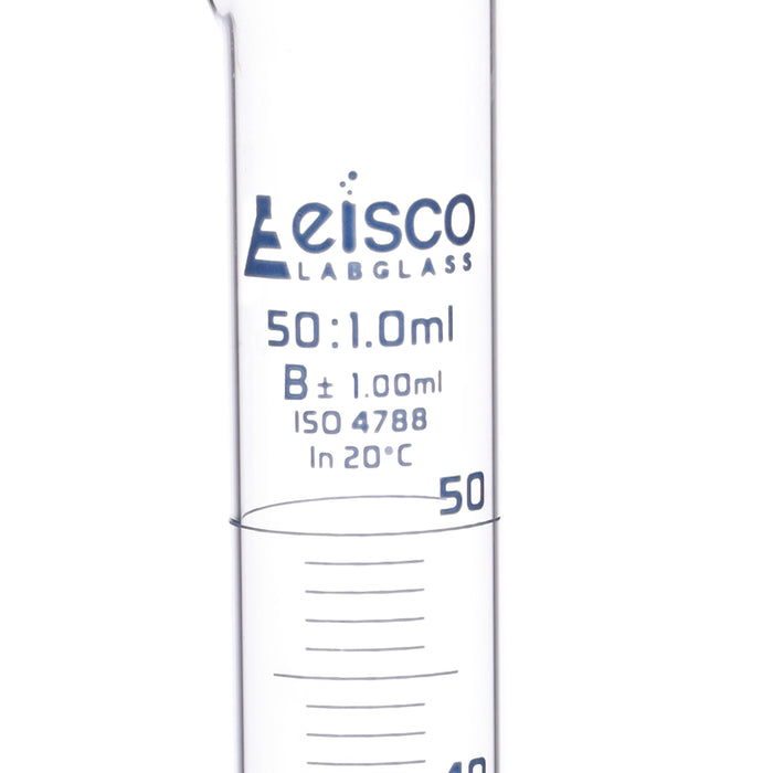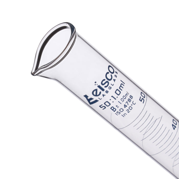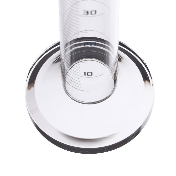 50ml graduated measuring cylinder made of high quality, heavy duty Borosilicate 3.3 glass. Spout for easy pouring, and round base for extra stability. Class B tolerance, ±1.00ml as per DIN EN ISO 4788 standard. Blue printed graduations and specifications. 1ml subdivisions. Cylinder stands 7.5" tall, with a base measuring 2" wide. Inner diameter of cylinder body measures 22mm (0.8"), and outer diameter measures 27mm (1").
