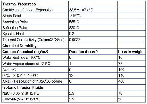 Autoclavable, with superior chemical durability. Low temperature gradient- can withstand high temperatures & thermal shocks. Eisco Labs Borosilicate glass has the following heat tolerances: Strain Point -515°C | Annealing Point 565°C | Softening Point 820°C. Calibrated to contain.