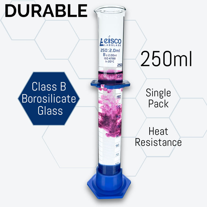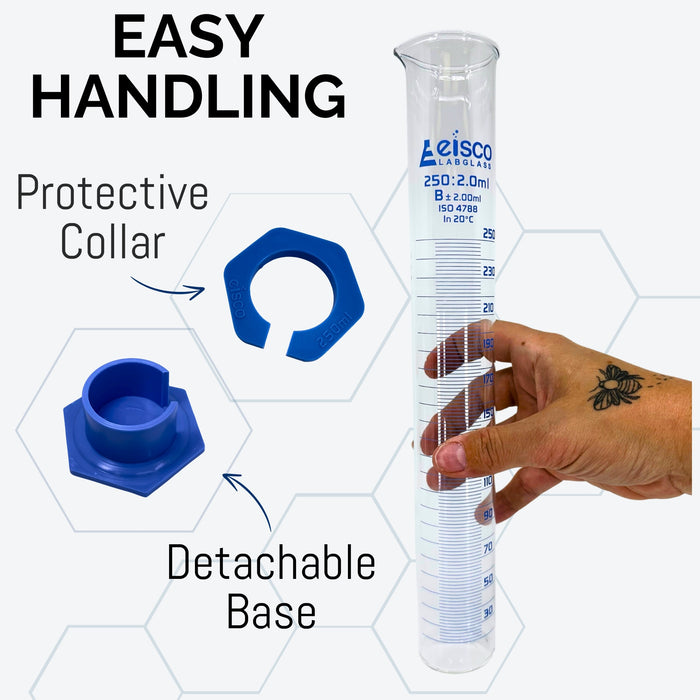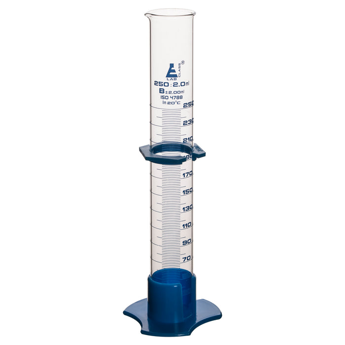 Graduated Cylinder, 250mL - Class B - Detachable, Plastic Hexagonal Base & Protective Collar - Blue Graduations - Borosilicate Glass